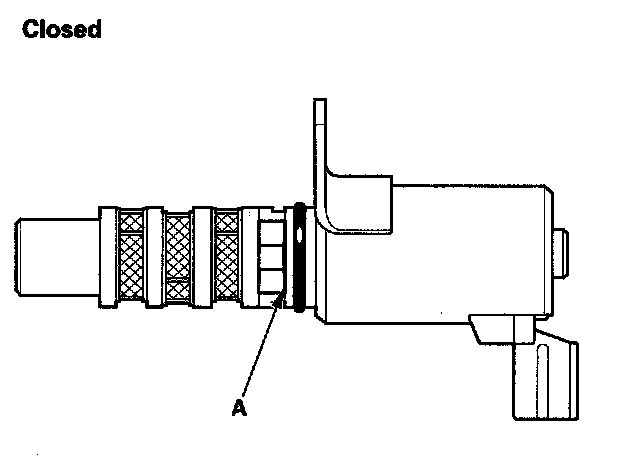 6. Connect the battery negative terminal to VTC oil control solenoid valve 2P connector terminal No. 1. Appearance of inner valve (A) in the port should be at least 0.05 in. (1.2 mm). If the inner valve does not open, replace it; then go to step 7.