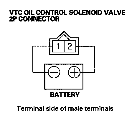 5. Connect the battery positive terminal to VTC oil control solenoid valve 2P connector terminal No. 2.