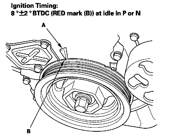 8. Aim the light toward the pointer (A) on the cam chain case. Check the ignition timing under a no load condition (headlights, blower fan, rear window defogger, and air conditioner are turned off).