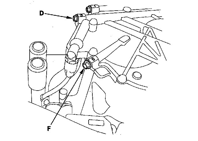 18. Connect the oil pressure gauge to the 3rd clutch pressure inspection port (D) and the 5th clutch pressure inspection port (F).