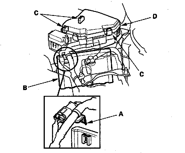 10. Release the three clips (C) securing the under-hood fuse/relay box (D), and lift up the box.