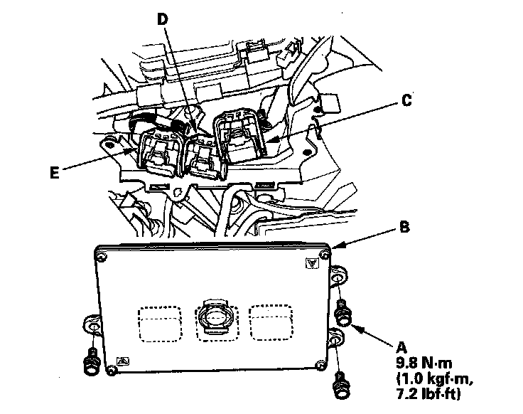 12. Disconnect the PCM connectors A (C), B (D), and C (E).