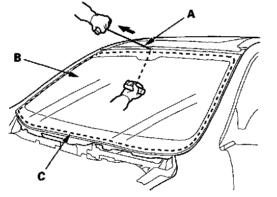 6. With a helper on the outside, pull the piano wire (A) back and forth in a sawing motion. Hold the piano wire as close to the windshield (B) as possible to prevent damage to the body and dashboard. Carefully cut through the rubber dam and adhesive (C) around the entire windshield.