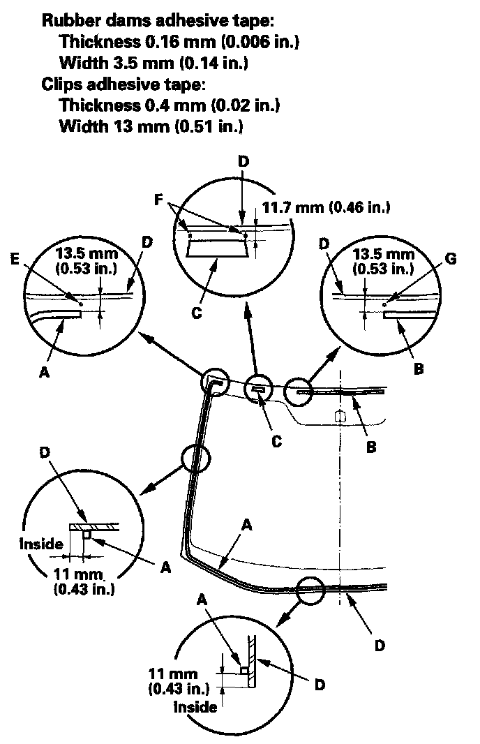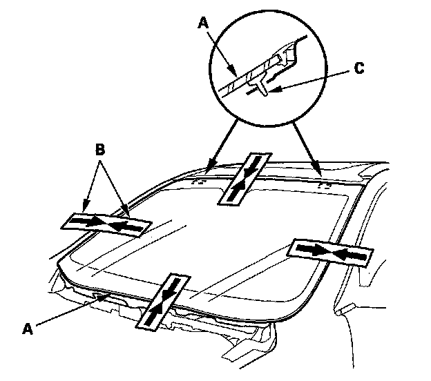 11. Attach the side rubber dam (A), upper rubber dam (B), and clips (C) with adhesive tapes to the inside face of the windshield (D) as shown: