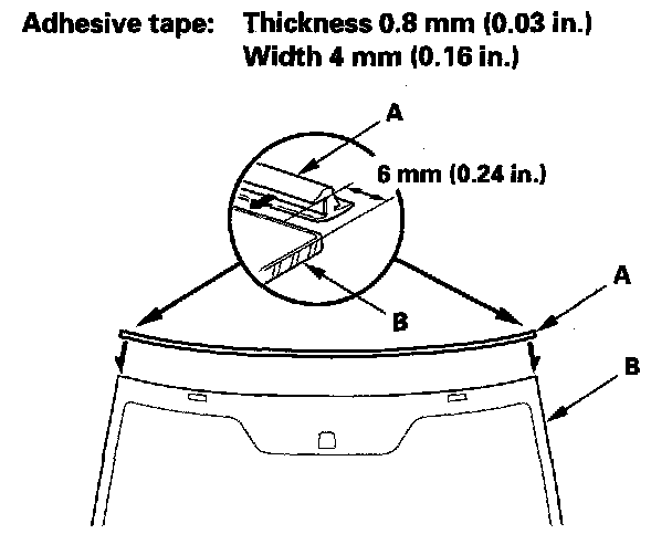 12. Attach the molding (A) with adhesive tape to the upper edge of the windshield (B), Be careful not to touch the windshield where adhesive will be applied.