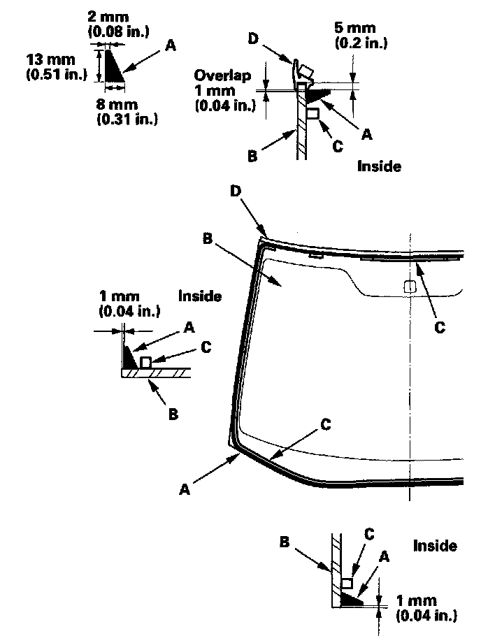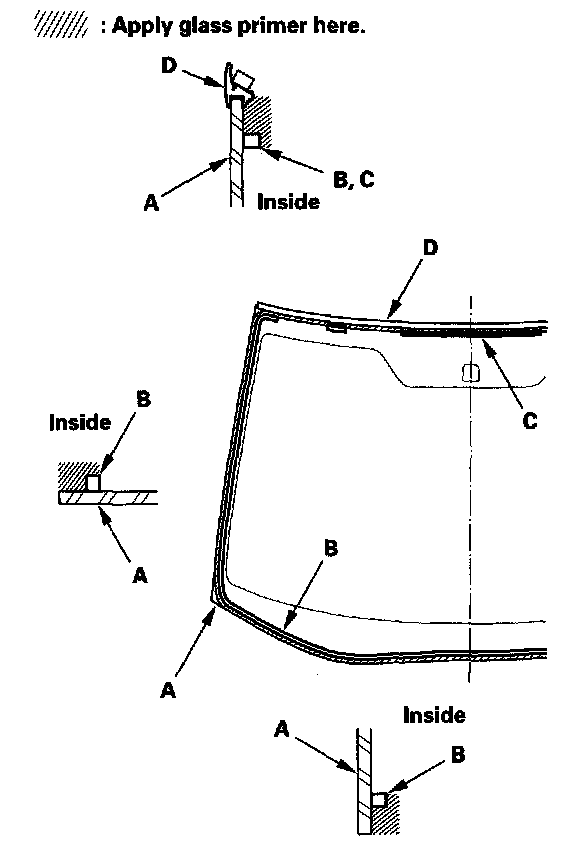 16. With a sponge, apply a light coat of glass primer around the edge of the windshield (A) between the rubber dams (B, C) and molding (D) as shown, then lightly wipe it off with gauze or cheesecloth: