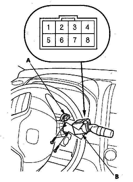 2. Disconnect the dashboard wire harness 8P connector (A) from the wiper/washer switch (B).
