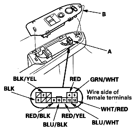 2. Disconnect the 13P connector (A) from the power mirror switch (B).