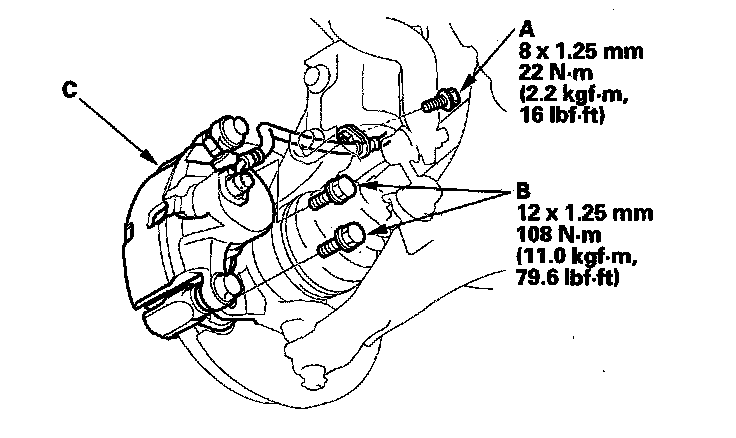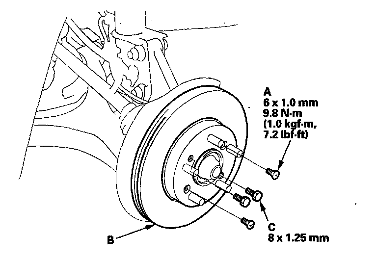 NOTE: If the brake disc is stuck to the hub, screw two 8 x 1.25 mm bolts (C) into the brake disc to push it away from the hub. Turn each bolt 90 degrees to prevent the brake disc from binding.