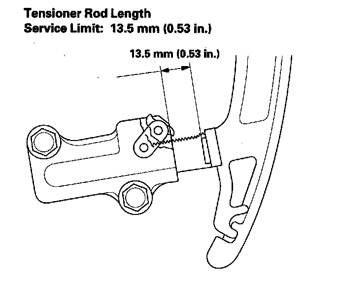 12. Measure the tensioner rod length between the tensioner body and bottom of the flat surface section on the tensioner rod. If the length is more than the service limit, replace the cam chain and oil pump chain.