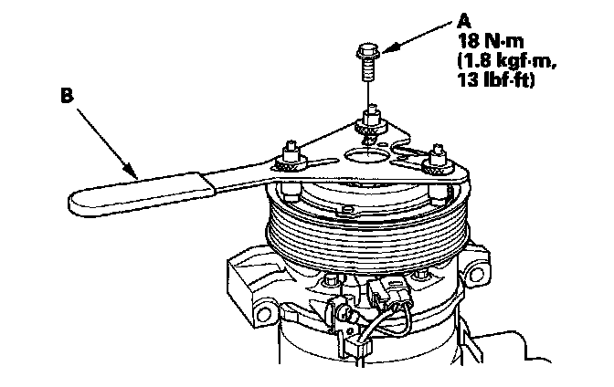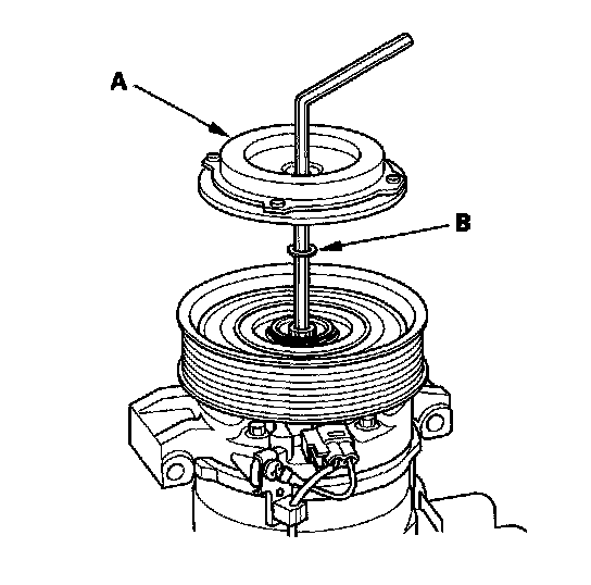 1. Remove the center bolt (A) while holding the pressure plate with a commercially available A/C clutch holder (B).
