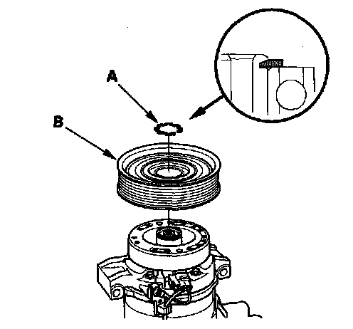 3. If you are replacing the field coil, remove the snap ring (A) with snap ring pliers, then remove the rotor pulley (B). Be careful not to damage the rotor pulley and A/C compressor.