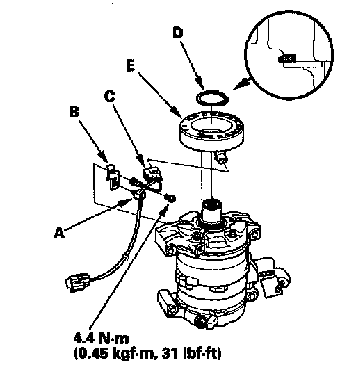 4. Remove the screw, the wire harness clip (A), and holder (B), then disconnect the field coil connector (C). Remove the snap ring (D) with snap ring pliers, then remove the field coil (E). Be careful not to damage the field coil and A/C compressor.