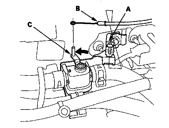 4. From under the hood, open the cable clamp (A), then disconnect the heater valve cable (B) from the heater valve arm (C). Turn the heater valve arm to the fully opened position as shown.