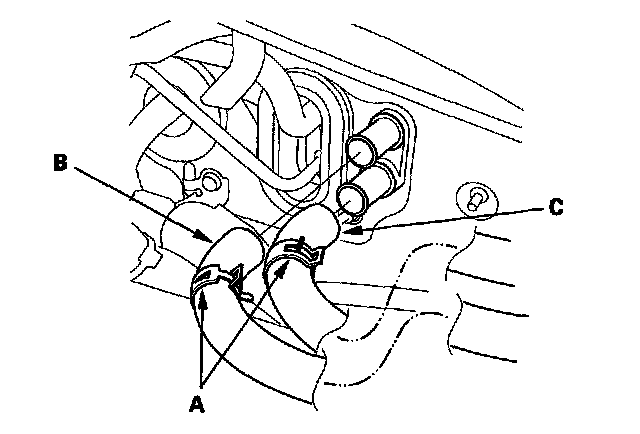 6. Slide the hose clamps (A) back, then disconnect the inlet heater hose (B) and the outlet heater hose (C) from the heater core. Engine coolant will run out when the hoses are disconnected; drain it into a clean drip pan. Be sure not to let engine coolant spill on the electrical parts or the painted surfaces. If any coolant spills, rinse it off immediately.