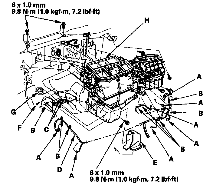 10. Disconnect the connectors (A) from the dashboard wire harness, the air mix control motor, the evaporator temperature sensor, the power transistor, the mode control motor, the blower motor, and the recirculation control motor, then remove the wire harness clips (B), the connector clips (C), the wire harness (D), the heater duct (E), and the clip (F). Disconnect the drain hose (G), then remove the mounting nuts and the blower-heater unit (H).