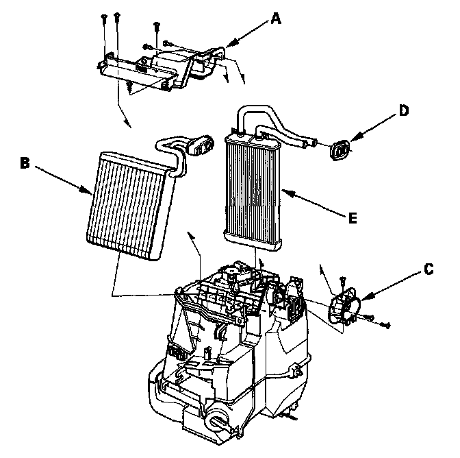 11. Remove the self-tapping screws and the expansion valve cover (A). With air conditioning; carefully pull out the evaporator core (B) so you don't bend the inlet and outlet pipes. Remove the self-tapping screws and the flange cover (C), then remove the grommet (D), and carefully pull out the heater core (E) so you don't bend the inlet and outlet pipes.