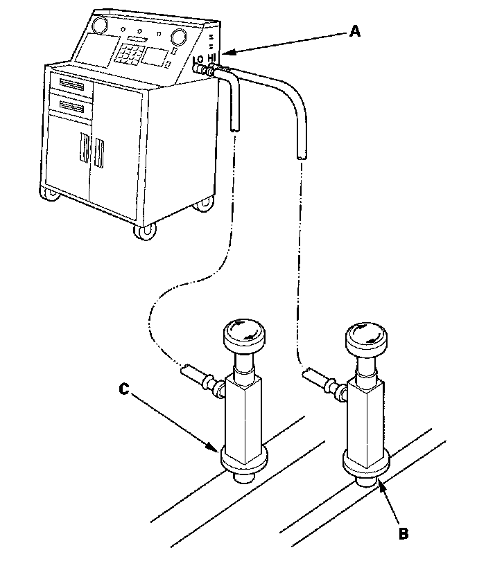 1. Connect an R-134a refrigerant recovery/recycling/charging station (A) to the high-pressure service port (B) and the low-pressure service port (C), as shown, following the equipment manufacturer's instructions.