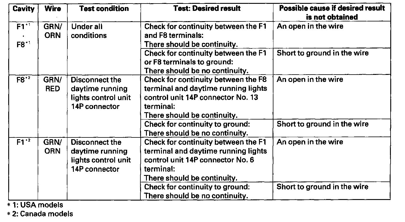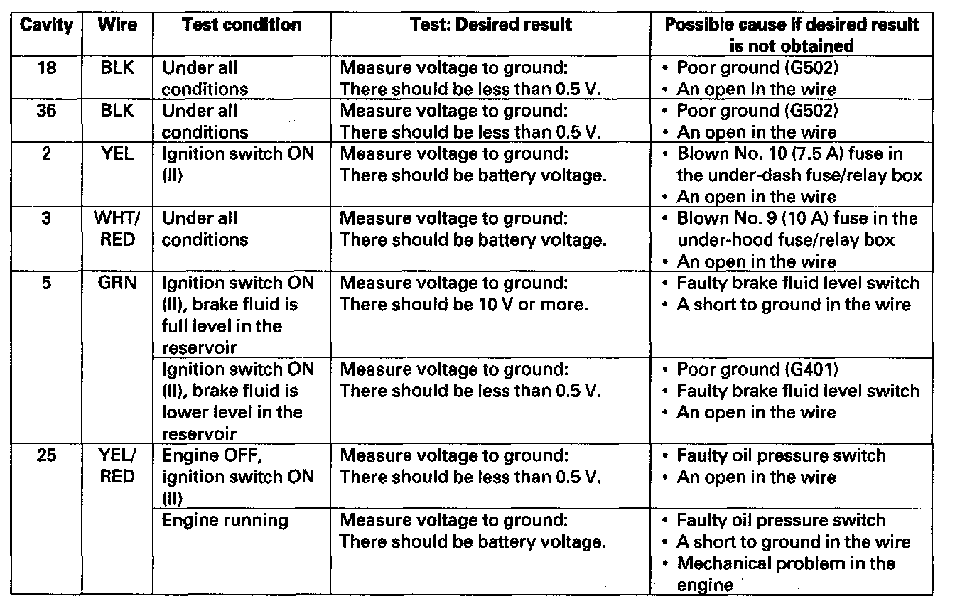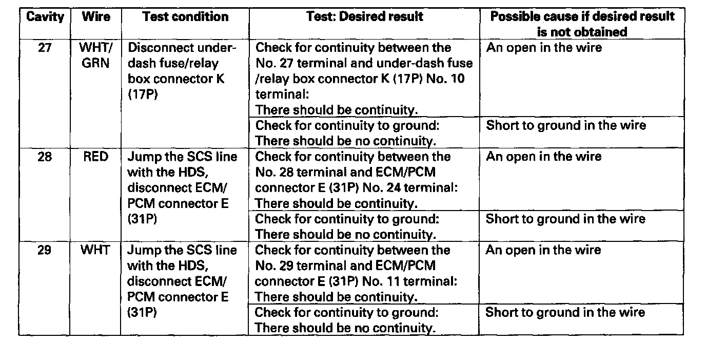 11. Reconnect the connectors to the under-dash fuse/relay box, and make these input tests at the appropriate connectors on the under-dash fuse/relay box.