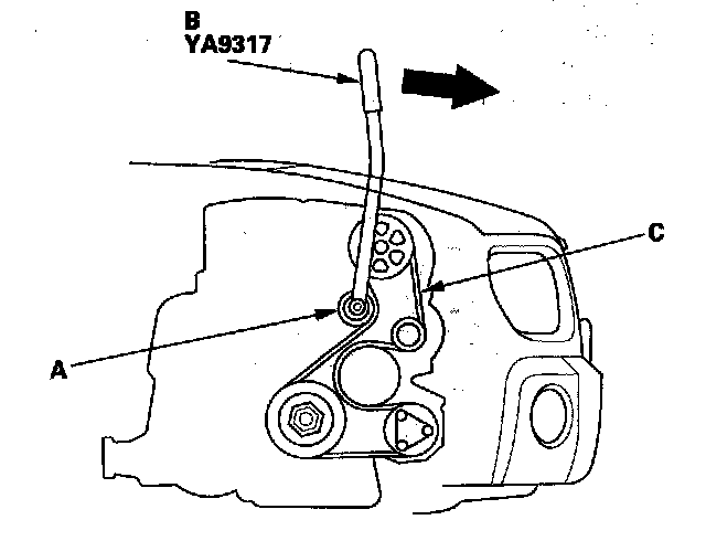 1. Move the auto-tensioner (A) using the belt tension release tool (B) in the direction shown to relieve tension from the drive belt (C), then remove the drive belt.
