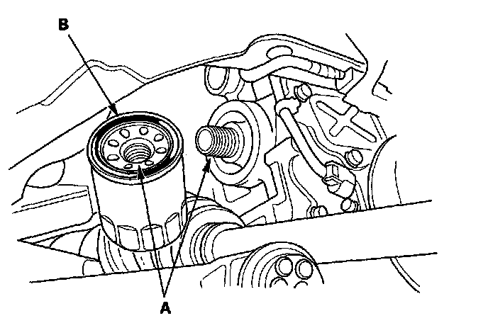 2. Inspect the threads (A) and rubber seal (B) on the new filter. Clean the seat on the engine block, then apply a light coat of new engine oil to the filter rubber seal. Use only filters with a built-in bypass system.