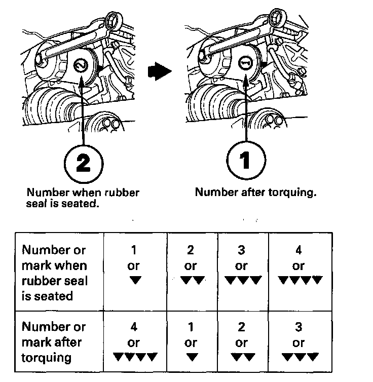 ^ Torque the filter by turning it clockwise three numbers or marks from the one you noted. For example, if number 2 is at the bottom when the seal is seated, torque the filter until the number 1 comes around the bottom.