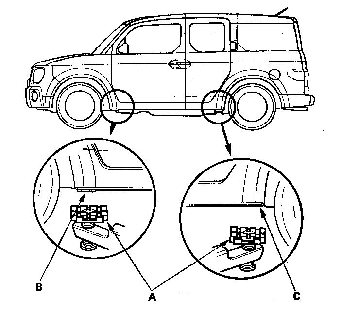 1. Position the lift blocks (A) under the vehicle's front support points (B) and rear support points (C).