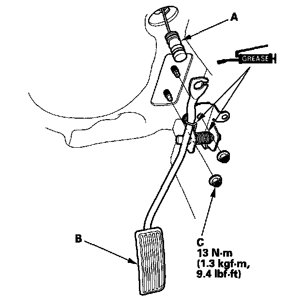 Remove the throttle cable (A) from the accelerator pedal (B).