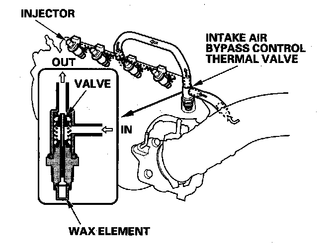 When the engine is cold, the intake air bypass control thermal valve sends air to the injector.