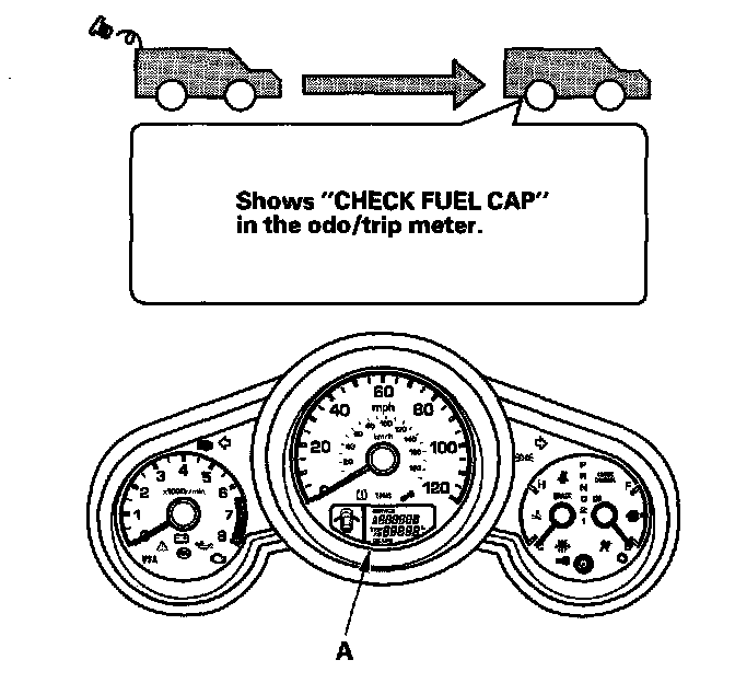 The first time a leak is detected a "CHECK FUEL CAP" message in the odo/trip meter display (A). To scroll to another message, press the select/reset button. The "CHECK FUEL CAP" message will appear each time you restart the engine unit the system turns the message off. Turn the engine off, then replace or tighten the fuel fill cap until it clicks at least once. The message should go off after several days of normal driving after the fuel fill cap has been tightened or replaced.