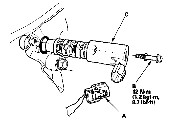 2. Remove the bolt (B) and the VTC oil control solenoid valve (C).