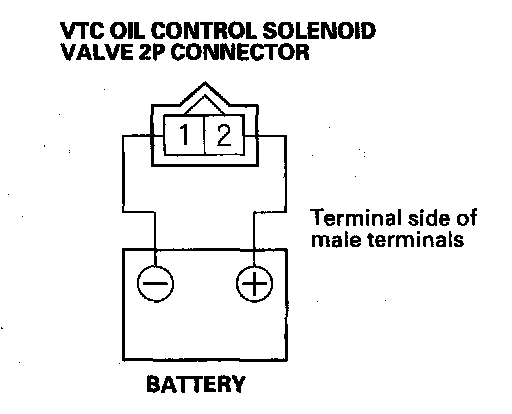 5. Connect the battery positive terminal to VTC oil control solenoid valve 2P connector terminal No. 2.