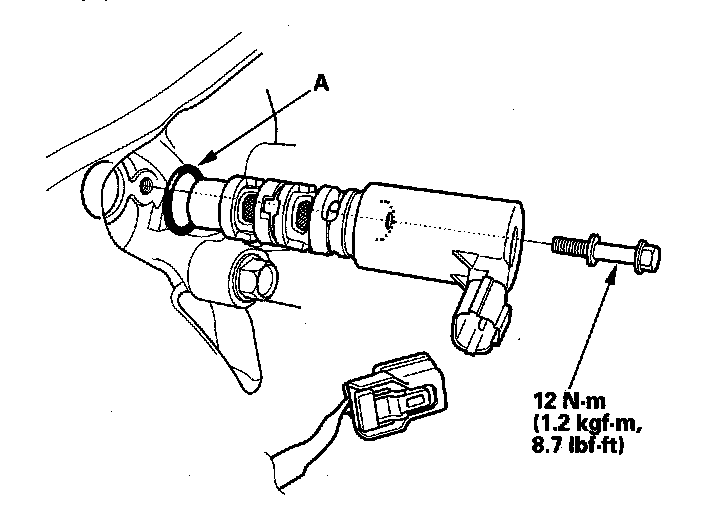 1. Disconnect the VTC oil control solenoid valve connector (A).