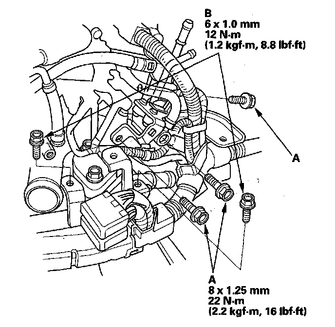2. Remove the three bolts (A) securing the evaporative emission (EVAP) canister purge valve bracket and remove the two bolts (B) securing the harness bracket.