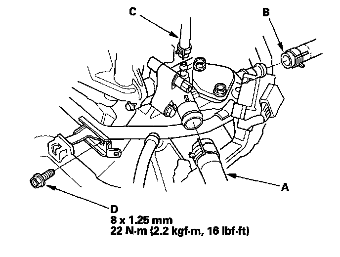 3. Remove the upper radiator hose (A), heater hose (B), water bypass hose (C), and connecting pipe mounting bolt (D).