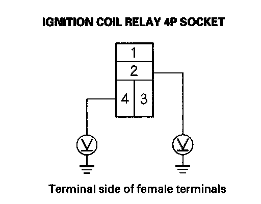 3. Measure the voltage between ignition coil relay 4P socket terminal No. 2 and body ground, then terminal No. 4 and body ground.