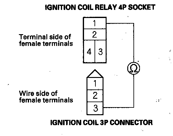4. Check for continuity between ignition coil relay 4P socket terminal No. 1 and each ignition coil 3P connector terminal No. 3.