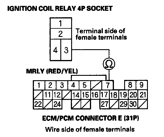 12. Check for continuity between ignition coil relay 4P socket terminal No. 3 and the ECM/PCM connector terminal E7.