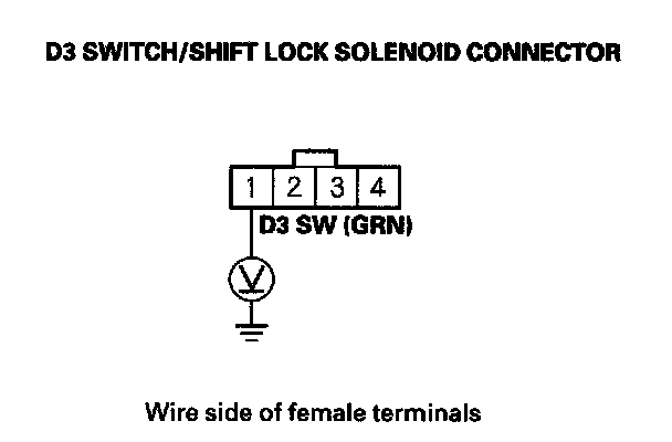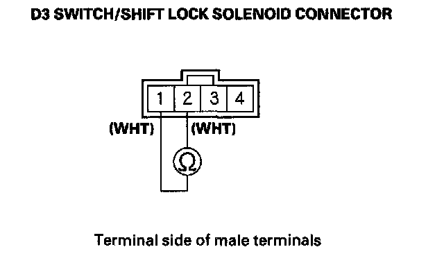 6. Check for continuity between D3 switch/shift lock solenoid connector terminals No. 1 and No. 2 while pressing the switch and when the switch is released.