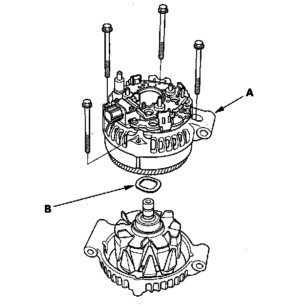 15. Check for continuity between each slip ring and the rotor (B) and the rotor shaft (C).