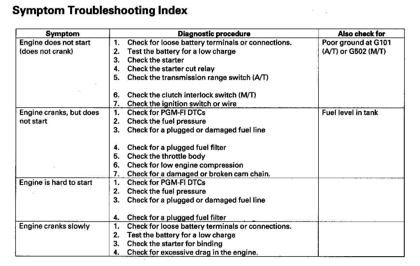 Symptom Troubleshooting Index: