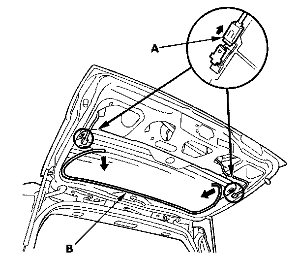 2. Disconnect the rear window defogger connectors (A), and remove the rear window trim (B).