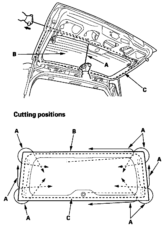 5. With a helper on the outside, pull the piano wire (A) back and forth in a sawing motion. Hold the piano wire as close to the rear window (B) as possible to prevent damage to the tailgate, and carefully cut through the adhesive (C) around the entire rear window.