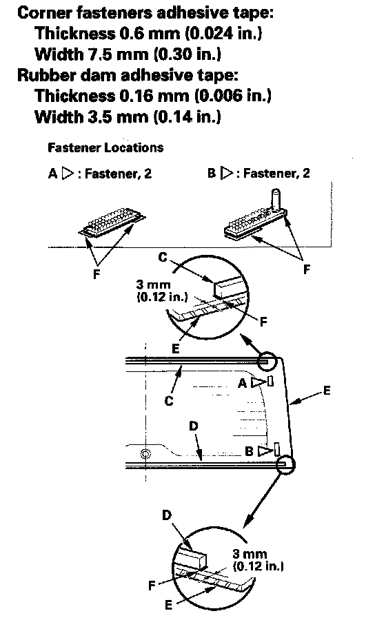 10. Attach the upper corner fasteners (A) and lower corner fasteners (B) with adhesive tape. Attach the upper rubber dam (C) and lower rubber dam (D) with adhesive tape to the inside surface of the rear window (E) as shown: