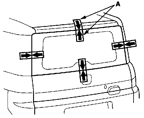 12. Set the rear window in the opening, and center it. Make alignment marks (A) across the rear window, tailgate, and body with a grease pencil at the four points shown. Be careful not to touch the rear window where adhesive will be applied.