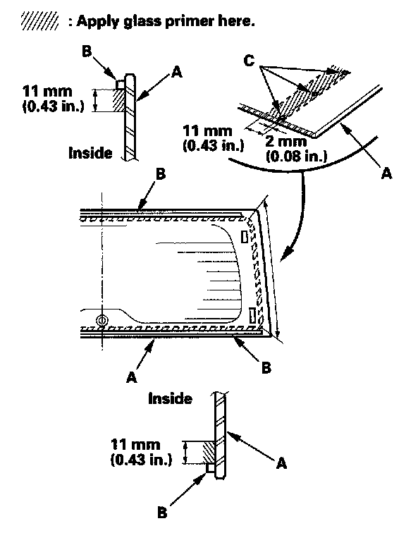 - Do not apply body primer to the rear window, and do not get body and glass primer sponges mixed up.