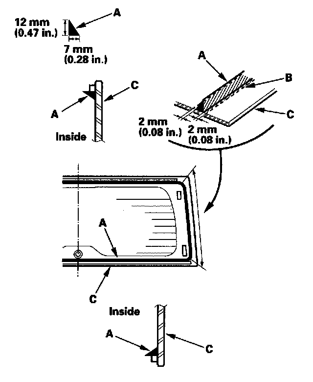 17. Put the cartridge in a caulking gun, and run a bead of adhesive (A) on the glass primer trace (B) you applied on step 14, and around the edge of the rear window (C) as shown.