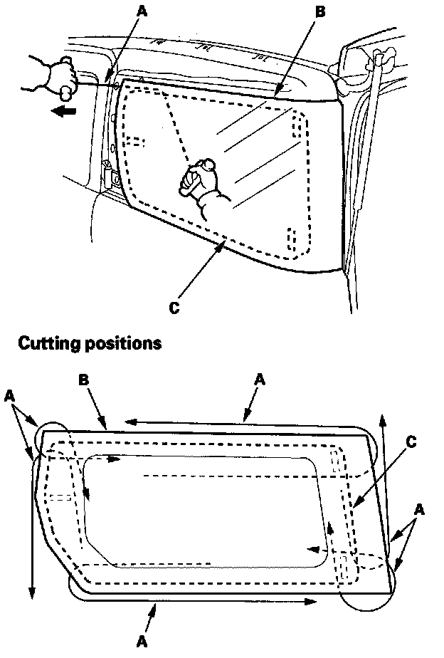 5. With a helper on the outside, pull the piano wire (A) back and forth in a sawing motion. Hold the piano wire as close to the quarter glass (B) as possible to prevent damage to the body, and carefully cut through the adhesive (C) around the entire quarter glass.