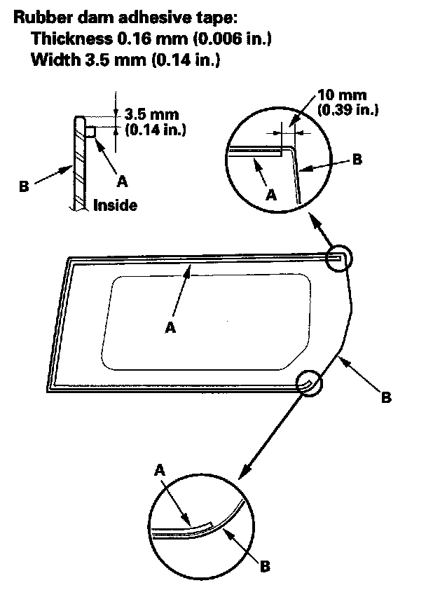 10. Attach the rubber dam (A) with adhesive tape to the inside surface of the glass (B) as shown. Be careful not to touch the glass where adhesive will be applied.