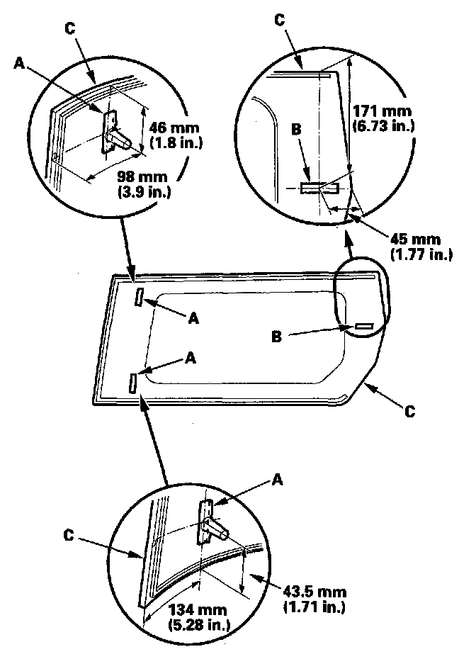 11. Before installing the clips (A, B), apply primer to the inside face of the quarter glass (C) where clips will be installed, and apply the clips with adhesive tape. Be careful not to touch the quarter glass where adhesive will be applied.